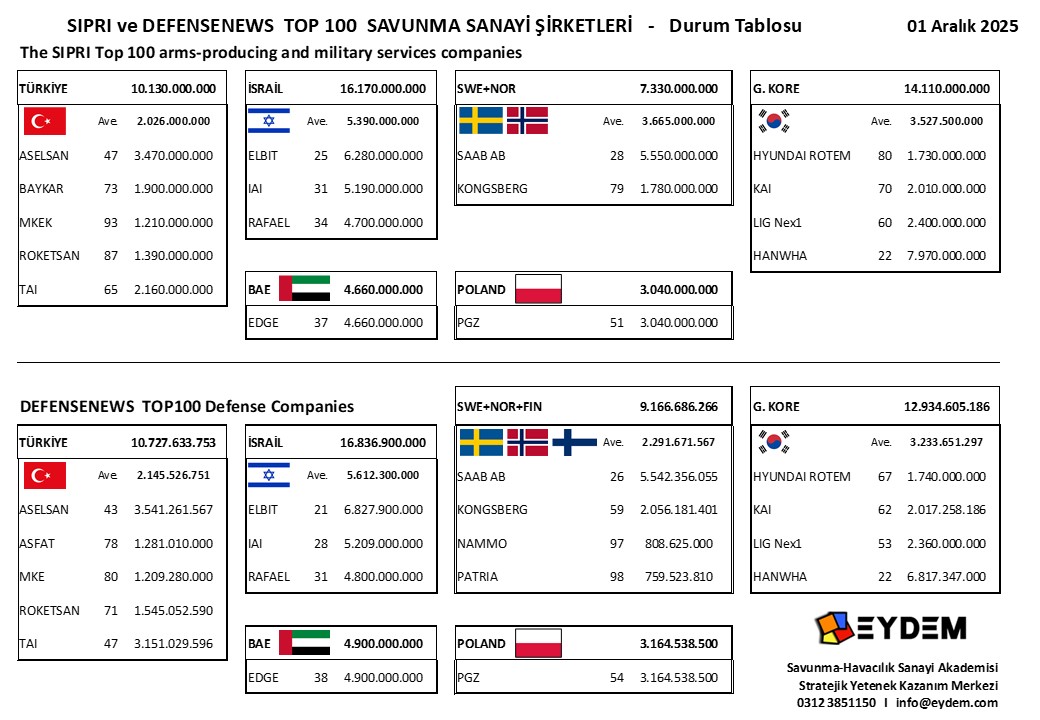 SIPRI TOP100 Listesine 5 şirketimiz girdi. ASELSAN, BAYKAR, MKEK, ROKETSAN, TAI tebrikler ve teşekkürler ......